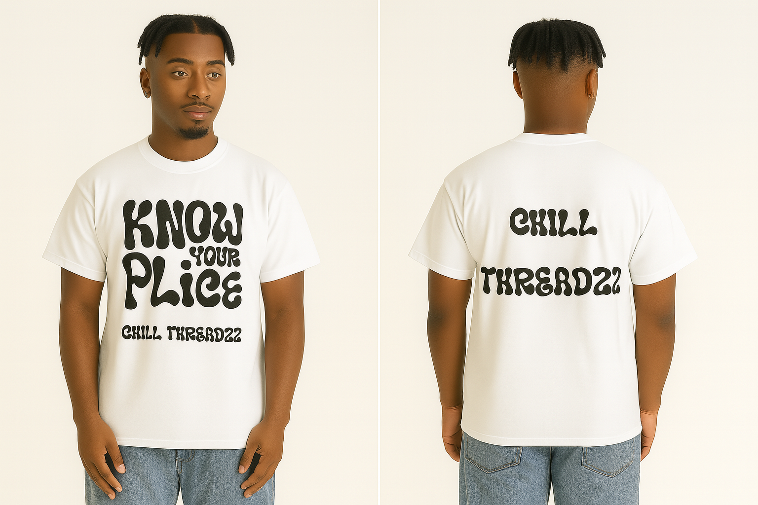 Make your presence known without saying a word in the Chill Threadzz: Status Statement tee. Featuring bold, psychedelic lettering that reads “KNOW YOUR PLACE” across the chest and “CHILL THREADZZ” stamped on both the front and back, this shirt blends retro attitude with streetwear edge. The crisp white fabric and oversized fit give it a clean, elevated look while the powerful graphic keeps it unapologetically raw.